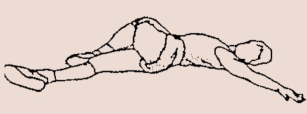 Étirement : Croisez les jambes en fléchissant un genou et en gardant l’autre jambe tendue. Posez ensuite la main opposée sur le genou fléchi et tournez doucement le bassin de ce côté. Vous ressentez ainsi une tension dans les muscles lombaires et la région fessière.