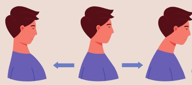Phase 2 — Relâchement et projection (5 secondes) : Relâchez complètement. Projetez ensuite doucement la tête vers l’avant en gardant le regard droit — sans pencher la tête. Maintenez ainsi 5 secondes.