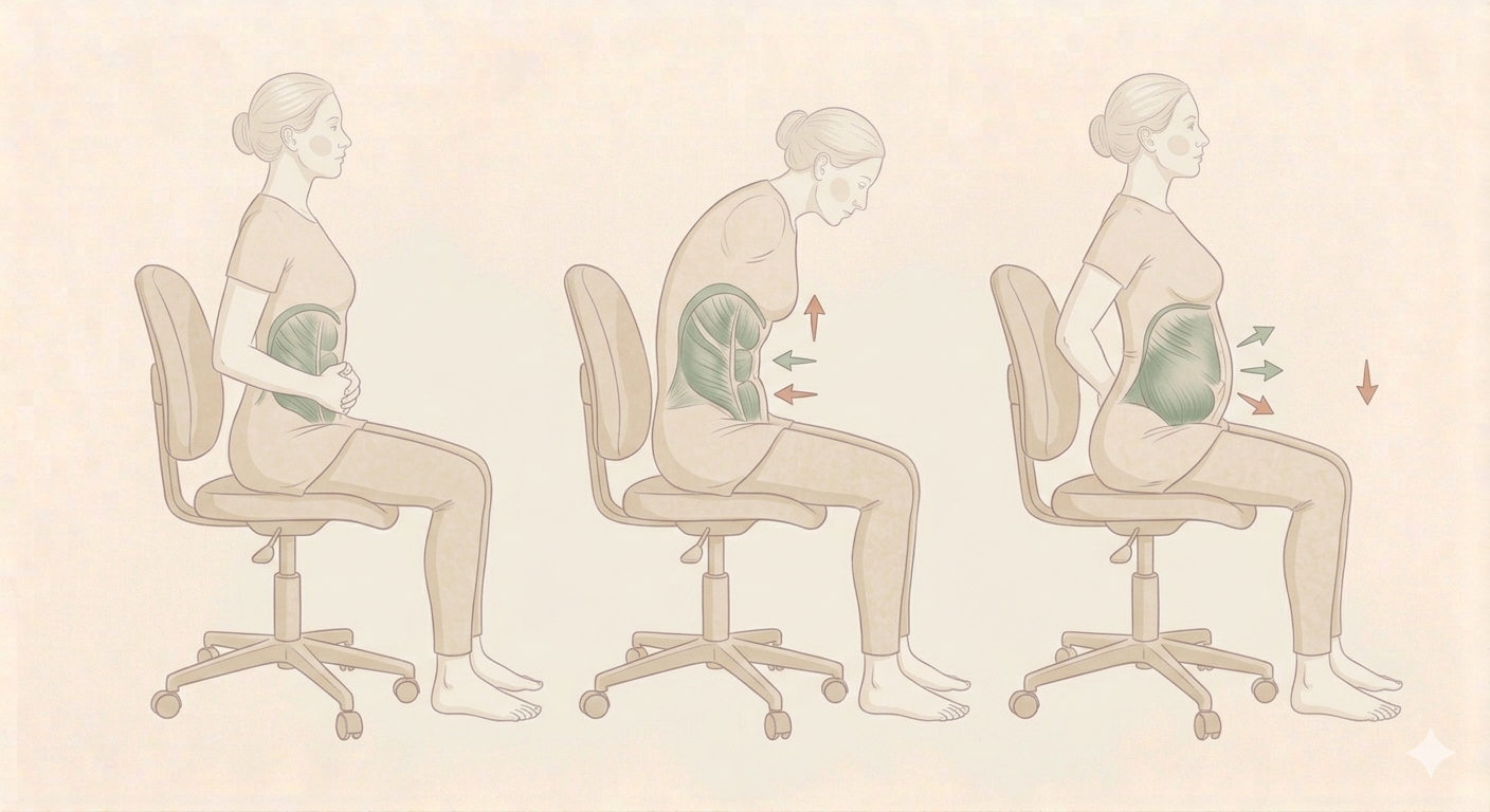 En position assise, le transverse se relâche naturellement et laisse les viscères peser sur le plancher pelvien. En conséquence, les vertèbres lombaires perdent leur soutien profond et les disques intervertébraux se compriment davantage. Travailler le transverse en position assise permet ainsi de corriger ce déséquilibre directement dans la posture la plus problématique du quotidien — sans interrompre votre journée de travail.
